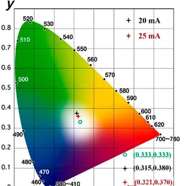 测试结果表明,作为发光器件,其光线的显示范围非常接近于自然光(图中绿色点),作为半导体器件,其稳定性也较好,在测试的两个月期间,几乎没有性能下降。