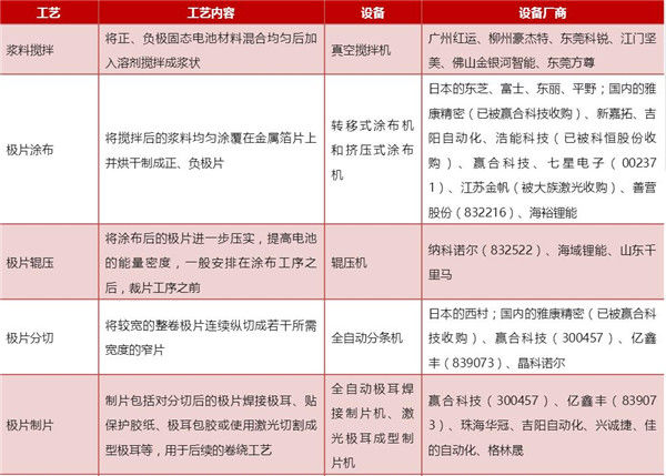 表1 锂电池生产工艺及设备介绍