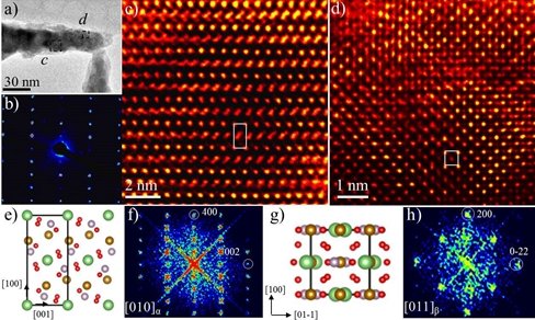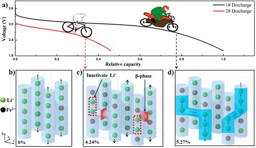 北京大学深圳研究生院新材料学院潘锋教授课题组最近在LiMn1-xFexPO4材料的结构与性能研究取得重要进展。他们成功合成了两种高铁锂反位量的α-LiMn1-xFexPO4纳米材料(50纳米的颗粒),相近的反位程度却表现出了极大的电化学性能差异。通过和布鲁克海文国家实验室、德国于利希国家实验室、美国阿贡国家实验室等合作,课题组对两种材料的结构进行了深入分析,用高精度球差电子显微镜首次发现磷酸铁锰锂的第二相β-LiMn1-xFexPO4以量子点(2纳米左右)嵌在α-LiMn1-xFexPO4 50纳米颗粒中。研究发现性能好的材料其铁锂反位量高,产生了许多的缺陷位置,因为这些缺陷点打通了相邻的其他方向的传输,使得锂离子的传输从一维锂离子通道传输扩展成为三维通道传输,从而提高了该锂电池材料的充放电性能。如果α-LiMn1-xFexPO4材料存在第二相β-LiMn1-xFexPO4以量子点嵌入形成套嵌结构的纳米材料后,嵌入量子点将堵塞部分锂离子的三维通道传输,从而降低了锂离子在整个晶体的传输效率,影响了该锂电池材料的充放性能。