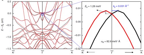 为解决这一问题,杨洪新及其合作者对铁磁金属和石墨烯界面进行了深入研究,其结构如图1所示,发现在单层Co与石墨烯界面可以诱导高达1.14meV的DMI,而三层Co与石墨烯界面则可以诱导强度为0.49meV的DMI,其强度完全可以与部分铁磁金属/重金属界面DMI相比,更为有意思的是,该体系的物理机制完全不同于Fert-Levy型DMI,从图2可以看到,在Co/Pt结构中,DMI在界面铁磁层Co层最大,而其能量来源,即SOC能量并非来自Co层,而是来自界面的贵金属Pt层;在graphene/Co中,DMI和SOC能量则都在Co层内,该差别的物理本源是因为在graphene/Co的界面DMI是Rashba效应诱导的DMI(如图2右),而Co/Pt界面为Fert-Levy型。为验证Rashba效应诱导的DMI,杨洪新与其合作者进一步通过第一性原理计算了不同磁方向上的能带变化进而计算出Rashba系数,从Rashba系数计算出DMI大小为0.18meV,与第一性原理计算所得0.49meV在同一量级(如图3)[HY et al. Nature Materials (2018) doi:10.1038/s41563-018-0079-4]。