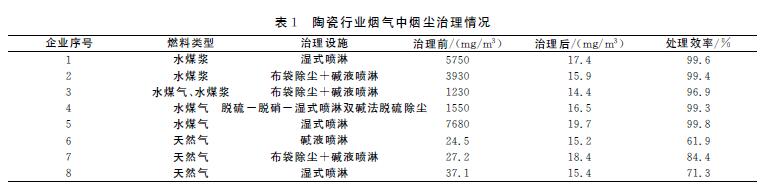 陶瓷行业废气中烟尘来源主要是生产制造过程中产生的颗粒物以及水煤气、水煤浆燃烧产生的烟尘。表1选取了此次监测中较为典型的8家陶瓷企业进行对比分析,从治理前后的数据可知,用水煤浆、水煤气为燃料的企业,治理前烟尘含量明显高于天然气为燃料的企业,各家企业通过投用除尘技术后,均能有很好的除尘效率,处理后烟尘浓度明显降低。