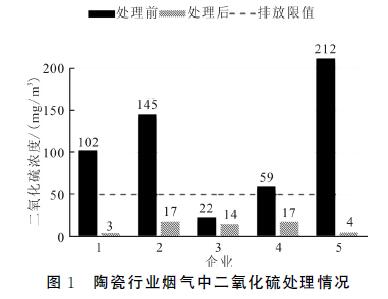 陶瓷行业废气中二氧化硫采用的脱硫技术主要有干法脱硫、活性炭脱硫、湿法脱硫、石灰法脱硫等。影响陶瓷行业废气中二氧化硫含量的主要因素是燃料以及陶瓷原料。考虑燃料性质、脱硫设备等因素,截取25家陶瓷企业中具有代表性意义的5家企业进行分析,图1为这5家陶瓷企业废气中二氧化硫浓度处理前后的对比,其中企业1、2、4、5采用的是水煤气和水煤浆作为燃料,从图1中可看出其废气中的二氧化硫浓度治理前均高于排放标准,企业3由于采用了天然气作为燃料,二氧化硫浓度明显低于其他行业。使用不同的脱硫技术对废气进行处理后,废气中二氧化硫浓度均有明显降低,达到排放标准。