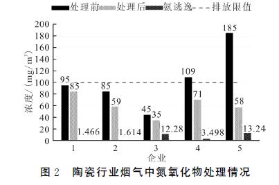 脱硝技术是陶瓷行业废气中氮氧化物的治理的主要手,通过喷还原剂,如氨、尿素等,对氮氧化物进行处理。此方法虽然有效,但对反应温度有所要求,陶瓷行业采用时往往会因为废气温度达不到其反应温度而影响其脱硝效率。从25家陶瓷企业中选取5家具有代表性意义的企业进行分析,从图2中可得知,虽然治理后几家陶瓷行业的废气均达到氮氧化物排放标准,但脱硝效率普遍不高,同时,企业3和5存在较为明显的氨逃逸情况。