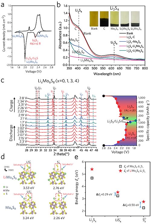 图3. 嵌锂LixMo6S8与中间产物多硫离子Li2S4相互作用机理研究。(a) 循环伏安曲线;(b) 多硫离子吸附实验;(c) 原位XRD 表征;(d) DFT 多硫离子吸附能计算;(e) Mo6S8嵌锂前后对多硫离子吸附能的变化。注:实验和理论计算表明嵌锂后的LixMo6S8较未嵌锂的Mo6S8在对多硫离子的吸附性能上有明显提高。