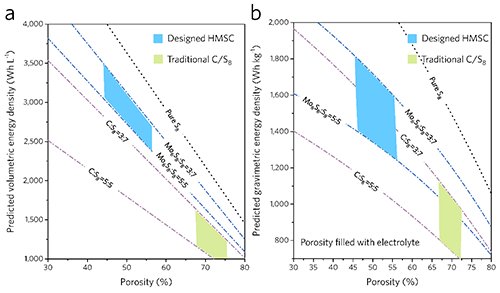 图2. 嵌入-转化混合正极HMSC(活性物质Mo6S8+S8含量85%,导电碳含量10%) 与C-S8复合电极对比示意图和真实电极SEM图片。注:负载量12.3 mg/cm2的HMSC电极厚度为121 μm远远低于负载量只有6.2 mg/cm2的C-S复合电极,因此使得该类电极材料在电极级别上重量和体积能量密度占据绝对优势。