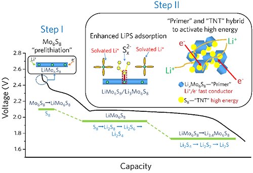 图4.Mo6S8在HMSC电极中的作用机理。注:步骤 I: 在硫还原之前预嵌锂(> 2.4 V); 步骤 II: 嵌锂后的LixMo6S8具有双功能: I) 吸附多硫离子从而抑制多硫离子穿梭效应和II) 提供电子和离子导电网络从而起到替代碳的作用。