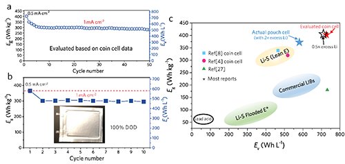 图6. HMSC型锂硫全电池性能。(a) 锂硫扣式电池 (6.9 mg cm-2S + 6.8 mg cm-2Mo6S8,电解液活性物质比~1.5 μL mg-1);(b) 锂硫软包全电池(电解液活性物质比~1.2 μL mg-1,~2倍金属锂过量);(c) 锂硫电池全电池能量密度对比图。注:图c为扣式电池实验参数推算的能量密度和安时级软包全电池的真实能量密度。