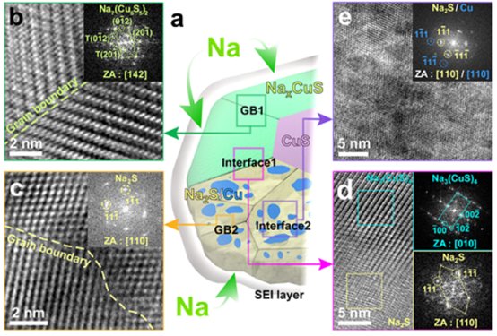 研究团队发现,在转化反应中,对于实现耐粉碎转化反应和容量恢复,半共格相界面(semi-coherent phase interface)和晶界起到关键作用。硫化铜通过渐进性的晶体变化,生成半共格相界面,最终阻止颗粒的粉碎。基于这一独特的机理,研究人员证实,无论大小和形态如何,硫化铜都具有高容量和高循环稳定性。Yuk教授表示:“使用硫化铜,可以促进钠离子电池的发展,有助于开发低成本储能系统,并解决微尘问题。”