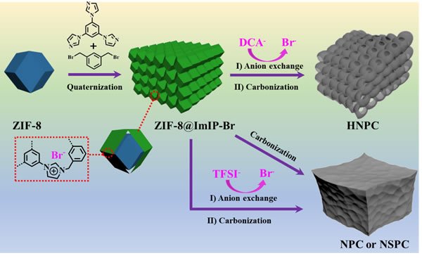 在国家自然科学基金和中国科学院战略性先导科技专项(XDB20030200)的资助下,中科院福建物质结构研究所结构化学国家重点实验室王瑞虎课题组利用离子聚合物包覆的ZIF-8核壳结构(ZIF-)作为前驱体,采用阴离子交换策略引入双氰铵根离子(DCA),经高温碳化诱导核壳结构分解并相互交联,成功制备出一类相互连接的中空氮掺杂多孔碳材料(HNPC)。这种结构能够减小材料的界面电阻,增强对多硫化物的吸附能力,提高活性物质的利用率,使得电池在8@ImIP2 C的倍率下稳定循环800圈以后,仍能达到562 mAhg-1的比容量,电化学性能明显优于传统杂原子掺杂的碳材料。上述研究工作发表在《先进功能材料》(Adv. Funct. Mater. 2019, 29, 1902322. DOI: 10.1002/adfm.201902322),文章的第一作者是李忠林。