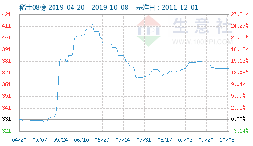 www.188betkr.com 讯10月7日稀土指数为375点,与昨日持平,较周期内最高点1000点(2011-12-06)下降了62.50%,较2015年09月13日最低点271点上涨了38.38%。(注:周期指2011-12-01至今)。
