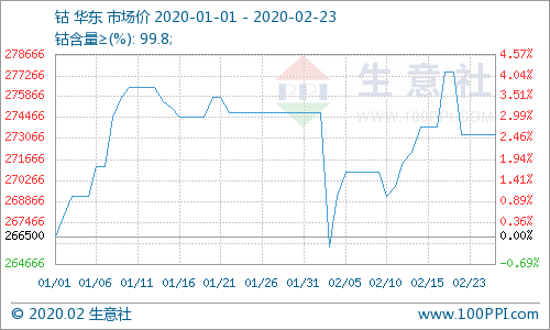 根据生意社数据监测显示:本周钴价大涨后大跌,钴市行情震荡调整。截止2月23日,钴价报价273333.34元/吨,较2月18日钴价报价均价277500.00元/吨下跌,跌幅1.50%。2月18日钴价较上周末钴价273833.34元/吨上涨,涨幅1.34%。本周钴价先涨后跌,钴市行情震荡调整。