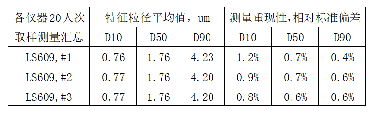 ▲ 3台LS-609激光粒度仪各对应的20位操作员的D50等特征粒径测试结果