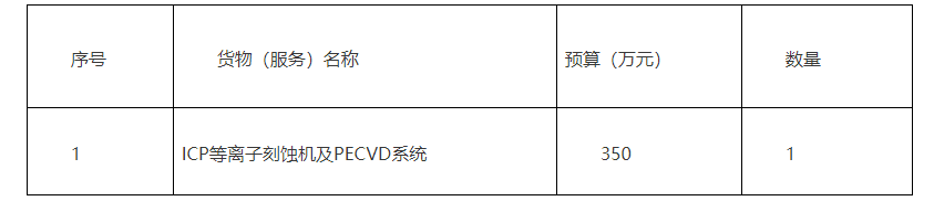 等离子刻蚀机——ICP及PECVD系统 招标项目的潜在投标人应在武汉市武昌区民主路789号南国悦公馆1206室获取招标文件,并于2022年12月19日 09点30分(北京时间)前递交投标文件。