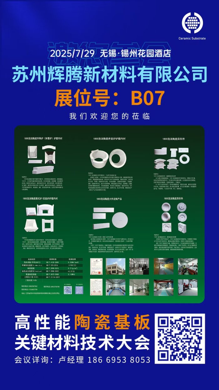 高性能陶瓷基板关键材料技术大会将于2025年7月29日在江苏无锡举办。苏州辉腾新材料有限公司作为参展单位邀请您共同出席。
