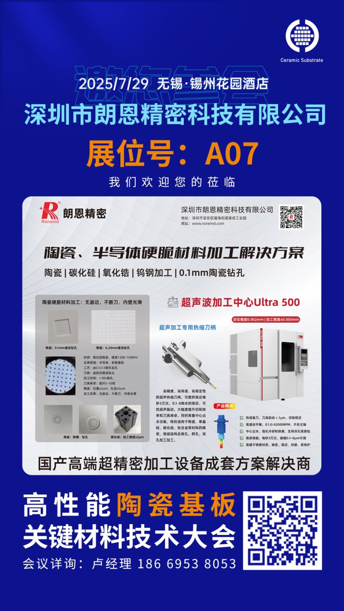 高性能陶瓷基板关键材料技术大会将于2025年7月29日在江苏无锡举办。深圳市朗恩精密科技有限公司作为参展单位邀请您共同出席。