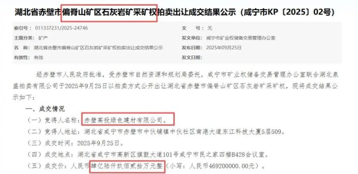 近日,赤壁高投绿色建材有限公司以46920万元成功竞得湖北省赤壁市偏脊山矿区石灰岩矿采矿权,石灰岩总资源量超3.25亿吨。