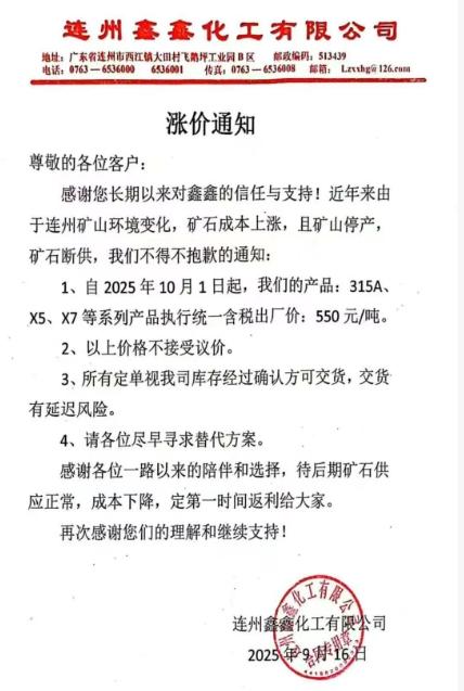 近日,碳酸钙粉体生产企业连州鑫鑫化工有限公司发布涨价通知,宣布自2025年10月1日起,公司产品:315A、X5、X7等系列产品执行统一含税出厂价:550元/吨。造成涨价的原因是:连州矿山环境变化,矿石成本上涨,且矿山停产,矿石断供。