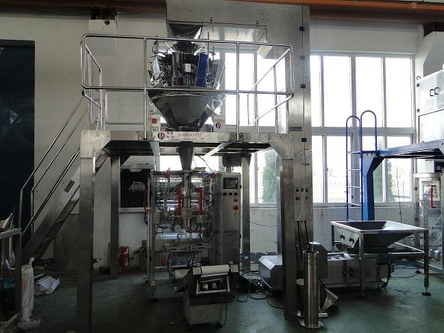 DP-520A组合称量全自动包装机 一 机组构成 1、DP系列主机 2、十头电脑组合称 3、Z型物料输送机 4、振动送料 5、支撑平 6、成品输送机 一 主要性能和结构特 1、全自动完成送料、计量、充填制袋、打印日期、成品输出的全部过程 2、计量精度高、效率高、不碎料 3、全新设计、亮丽外观、结构更合理、技术更先进 4、进口PLC全电脑控制系统、彩色触摸屏、操作方便、直观高效 5、进口伺服运膜系统、进口色标传感器、定位准确、整机性能**、包装美观 6、多种自动报警保护功能?*限度减低损耗 7、袋形多样化、可为客户提供枕形袋、插角袋、挂孔袋、连袋等 二 选配装置 1 双拉膜机构、插角机构、自动纠偏机构、打孔装置、连袋装置 三 适用范围 适合要求计量精度高及易碎的散状物体的包装:膨化食品、饼干、锅巴、果冻、糖果、炒货、开心果、苹果片、水饺、汤圆、朱古力、小五金件、药材等 四 主机技术规 机型 DP-520 薄膜宽度 520mm 制袋长度 80-350mm 制袋宽度 80-250mm 膜卷直径 320mm 包装速度 10-50?分钟 计量范围 150-2000ml 薄膜厚度 0.04-0.08mm 电源规格 220V 50Hz 3KW 机器尺寸 (L?488*(W?080*(H?490mm 机器质量 750kg