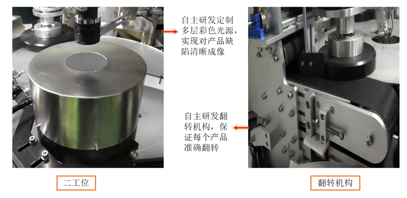 二工位:用于对产品的上表面外观缺陷进行检测,包括缺料、多料、破损、堵孔、包风(裂痕)、杂质等各种外观不良。此工位配备一组相机加两组镜头,两组镜头分别对应不同的外径范围(外?-25mm一 26-50mm一组)产品,配合旋转机构进行切换,方便快捷、/p>