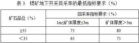 依据矿山矿石品位、矿体厚度等的不同,锶矿地下开采回采率最低指标要求分别为65%-80%(详见表3)、/span>