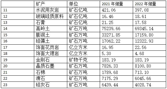 据统计,2021-2022年中?3种主要非金属矿产储量基本都有不同程度的变化。其中,菱镁矿、萤石、钾盐、重晶石、玻璃硅质原料、饰面花岗岩、金刚石、晶质石墨储量有所上升;耐火粘土、硫铁矿、磷矿、硼矿、钠盐、芒硝、水泥用灰岩、石膏、高岭土、膨润土、硅藻土、饰面大理岩、石棉、滑石、硅灰石储量较为明显的下降、/span>