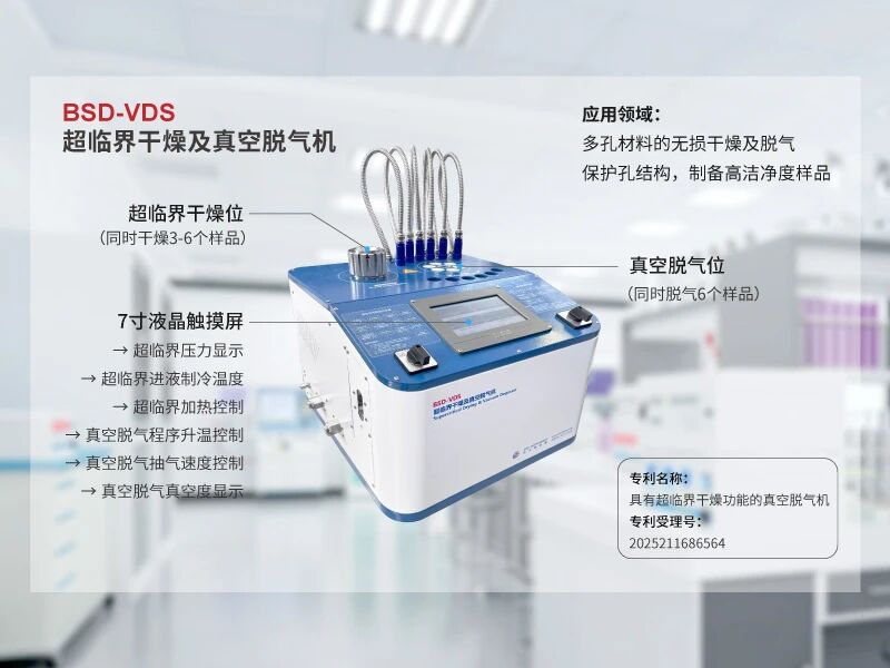 对多孔材料进行干燥,去除孔道内的溶剂、脂类、油类、水分等凝聚态杂质时,使用超临界干燥技术,利用超临界流体的高扩散性、高溶解性、无气液界面等特性,可避免材料孔道受到应力作用而造成孔结构破坏,导致的孔结构收缩、碎裂、孔道坍塌、孔结构变形等问题,能够在最大程度上保持多孔材料的孔结构与晶格结构状态,干燥效率高,干燥后样品纯净度高。(使用设备为:BSD-VDS超临界干燥及真空脱气机)
