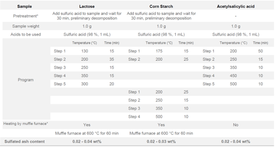 湿法灰化系统通过两种仪器的完美同步工作,得到最准确的结果。在这项研究中,通过对一些样品测试,如乳糖,玉米淀粉以及阿司匹林等。通过应用这些方法,测定的硫酸盐灰分含量低 0.02 - 0.04 wt% (如表1),很好的吻合于样品的真值、/p>