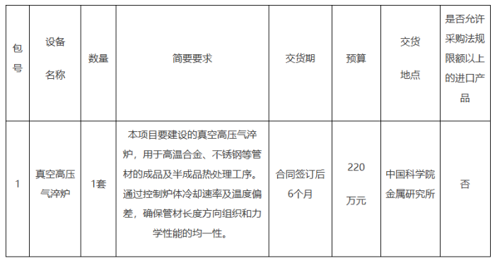 中国科学院金属研究所真空高压气淬炉采购项 招标项目的潜在投标人应在http://www.oitccas.com/;北京市海淀区丹棱街1号互联网金融中心20层获取招标文件,并于2025?1?4 09?0分(北京时间)前递交投标文件、/p>