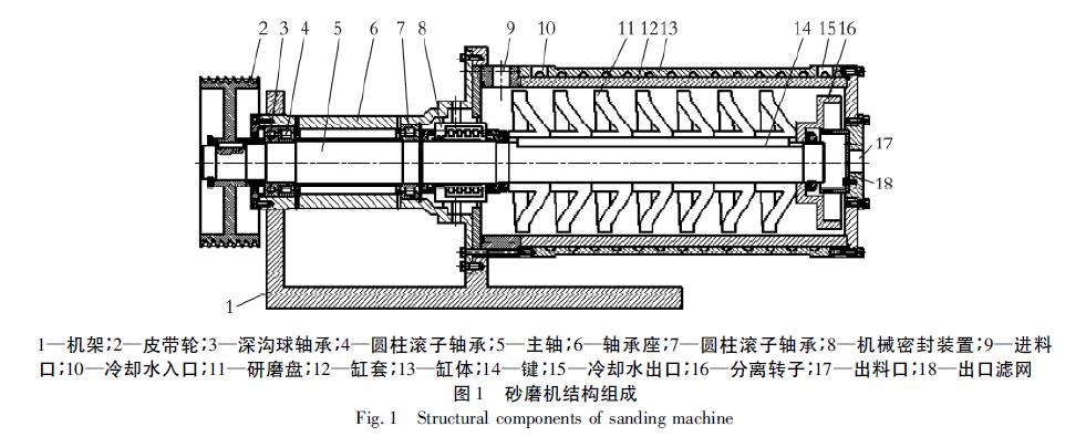 在机? 上,缸体和缸套之间的螺旋槽两端分别与冷却水入?0 和冷却水出口15 连通,形成缸体冷却水通道。主? 左端通过平键与皮带轮2 连接,由圆螺母轴向定位,主轴5 右端通过平键? 个研磨盘11连接,通过分离转子16,由圆螺母轴向定位,其中?个研磨盘自左至右是改进前端面垂直轴线的研磨盘、改进后端面带倾角的研磨盘交替安装。出口滤?8靠螺钉固定在右缸盖上,机械密封装? 把缸?2的工作腔与轴承座6 的润滑腔隔开、/p>