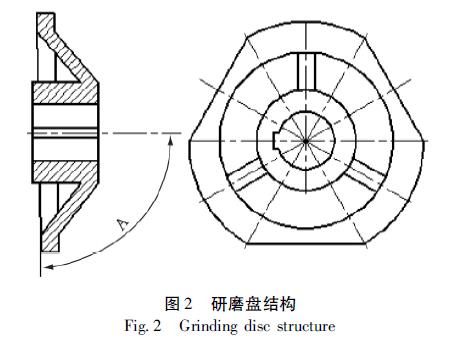 由图2 可见,研磨盘左端面与轴线方向成确定的夹角A,研磨盘旋转时,产生轴向力使固-液相混合物料轴向移动,碰到左端面与轴线方向垂直的相邻研磨盘阻挡时反弹,在两研磨盘间震荡,加强砂磨效果、/p>