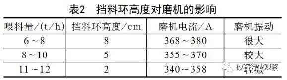 挡料环的高度直接影响磨内料层的厚度及粉磨效率。挡料环的高度过高,不利于磨床上的物料离心外溢,使得一部分合格成品在磨盘上停留时间过长,造成过粉磨增加能耗,同时也会导致料床增厚,削弱粉磨效率;挡料环的高度过低,则粉料外溢流速加快,一部分物料未得到研磨即被甩出磨盘之外,增加磨机排渣量,可能造成循环提升机堵塞,同时导致料床过薄,使得磨辊无法高压操作,磨机易产生振动。通过调整挡料环高度,磨机的参数变化见?所示、/span>