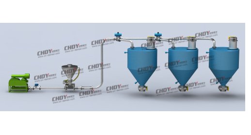 它是利用低于1kg/cm2 的气体压力,采用正压(吹送式),以较高的速度来推动或拉动物料使其通过整条输送线,因此该输送方式被称之为低压高速系统,它具有较高的气体-物料比