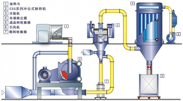 WFJ型超微粉碎机简介一、概况WFJ系列微粉碎机是我公司自行设计、开发研制的一种高效微粉碎机,物料的粉碎与粉粒的分级装于同一机体内而各自独立运转。本机由主机、旋风分离器、脉冲除尘器、电控箱四个部分组成,具有风选式、无筛、无网、粒度大小均匀等多种性能,生产过程连续进行。该机达到国际先进水平。该机具有功能全,结构紧港,技术性能稳定,耗电省,适应范围广不产生粉小,可调节粉体细度,维修简便等特点,广泛使用干化工、染料、涂料?..