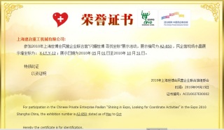 上海建冶重工机械有限公司参加2010年上海世博会民营企业联合?ldquo;闪耀世博 寻找坐标展示活动,展示编号为A2-850,民企馆现场水晶展示墙坐标为:X-LT,Y-12;展示日期为2010?5?1日至2010?0?1日 建冶重工参加世博会民企馆中国企业家创业风云录展示活动,同时为民企?..