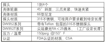 Dw952系列配件是专门为食品、饮料和制药应用而设计的,在这些应用领域清洁是非常重要的。两件DW952系列配件可连接多?个探头。该种配件采用了经FDA认证的材料。配件易于快速拆除,从而便于清洁和杀菌、br/> DW952T 系列配件与DW952 系列配件的特性是一样的,除了DW952T系列配件还有Teflon 包层的探头,这种探头的尖端被磨光,可满足*为苛刻的应用需求、br/> 应用:食品、饮料、制药、CIP