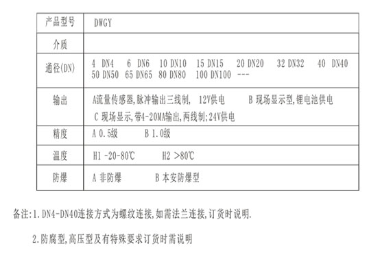 DWGY系列涡轮流量计结构简单、轻巧、精度高、复现性好、反应灵?安装维护使用方便等特点的新一代涡轮流量计,应用于测量封闭管道中与不锈钢1Cr18Ni9Ti?Cr13及刚玉AI2O3、硬质合金不起腐蚀作用,且无纤维、颗粒等杂质,工作温度下运动粘度小?×10-6m2/s的液?对于运动粘度大于5×10-6m2/s的液?可对流量计进行实液标定后使用.若与具有特殊功能的显示仪表配?还可以进行定量控制、超量报警等,是流量计量和节能的理想仪?