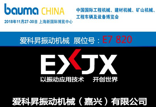 bauma CHINA 2018 将于2018平/span>11朇/span>27-30日在上海新国际博览中心举办。爱科昇振动机械(嘉兴)有限公司应邀参加,为您提供各种振动设备及解决方案、/span>