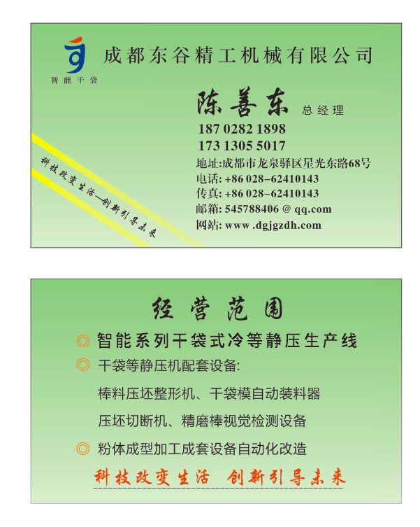 成都东谷精工机械有限公司是依托高端航天技术、专业从事智 能干袋式冷等静压技术研发及装备制造的高新技术企业。公司成立于2006年,独家 拥有行业多项专利技术;聚集行业内优秀技术人才,成功解决了粉体干袋成型过 中的效率低、材料利用率低、精度低等多项技术难题 公司研发的大尺寸干袋压机、多种智能干袋成型生产线、压坯整形机、压坯切 割机、自动计量装料机等自动化装备,采用智能控制系统,加工精度高、效率高 材料利用率高。凭借领先的技术、过硬的质量、高效的服务,公司赢得了硬质 金、粉末冶金、各类陶瓷、石墨、磁性材料等行业广大朋友的信任与赞誉 智能干袋—东谷精工,与您共创成功?/p>