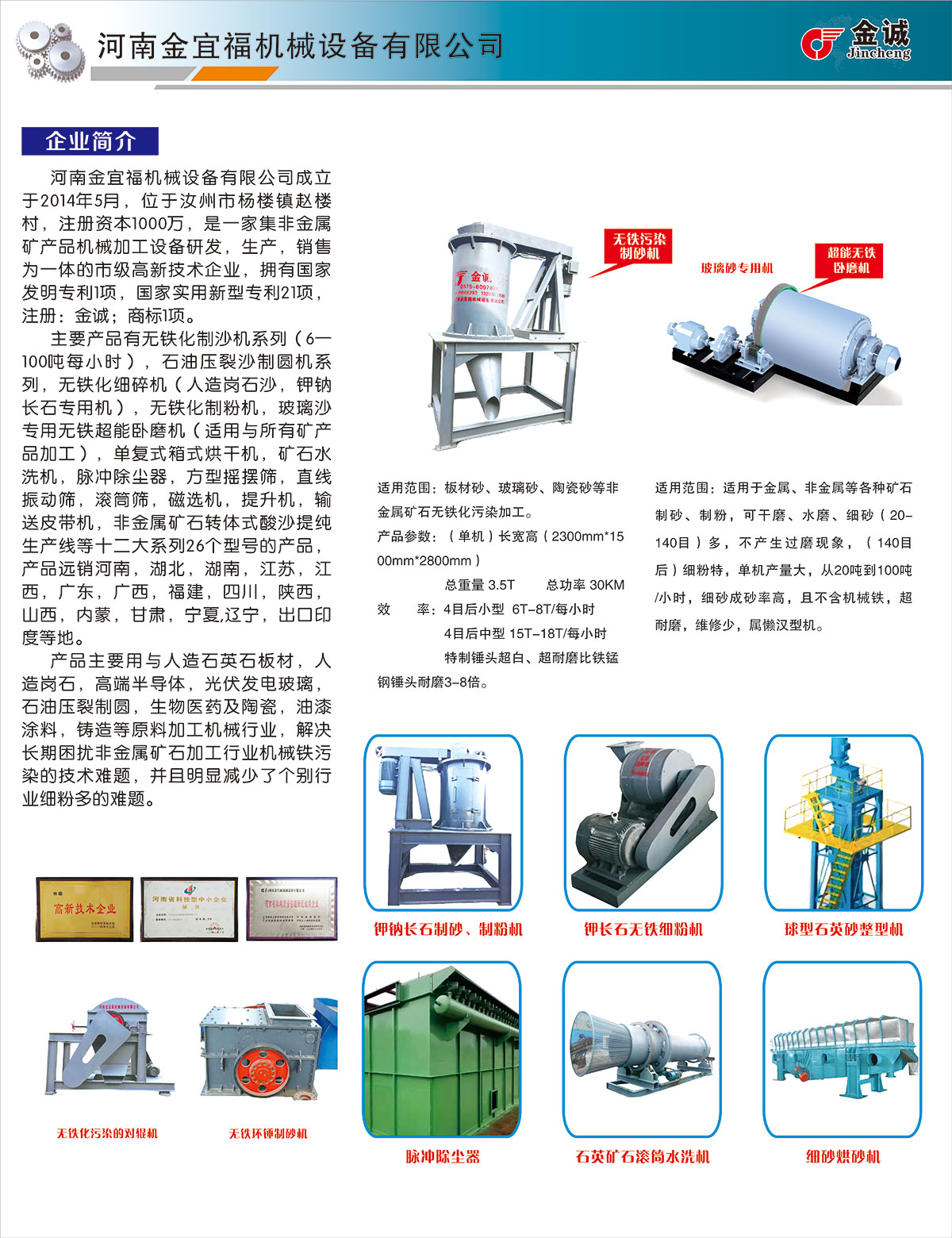 主要产品有无铁化制沙机系? 6-100吨每小时),石油压裂沙制圆机系列,无铁化细碎机(人造岗石沙,钾钟/span>长石专用?,无铁化制粉机,玻璃沙专用无铁超能卧磨机(适用与所有矿产品加工),单复式箱式烘干朹/span>,矿石水洗机,脉冲除尘器,方型摇摆筛,直纾/span>振动筚/span>,滚筒筛,磁选机提升机,输送皮带机,非金属矿石转体式酸沙提纯生产线等十二大系列26个型号的产品,产品远销河南,湖北,湖南,江苏,江西,广东,广西,福建,四川,陕西,山西,内蒙,甘肃,宁?辽宁,出口印度等地、/span>