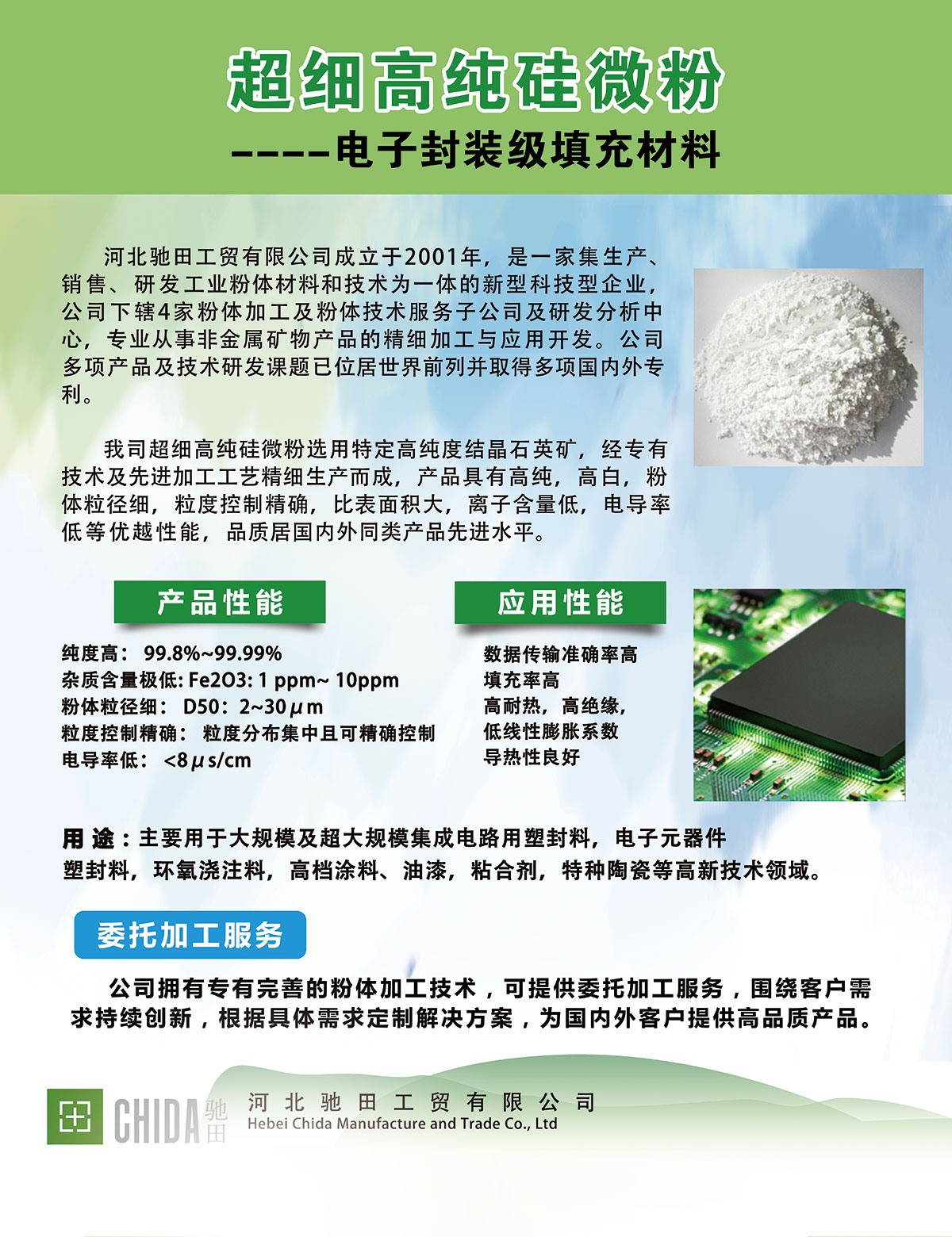 河北驰田工贸有限公司创立?001年,专业从事非金属矿物的科研开发及生产加工,已通过ISO90001国际质量管理体系认证。我司利用专有技术及先进加工工艺生产超细高纯石英粉,产品具有纯度高,白度高,粒度控制精确,低离子含量,低电导率等优越性能,广泛用于高端电子封装、硅橡胶、光学玻璃及特种陶瓷等高科技领域、/span>