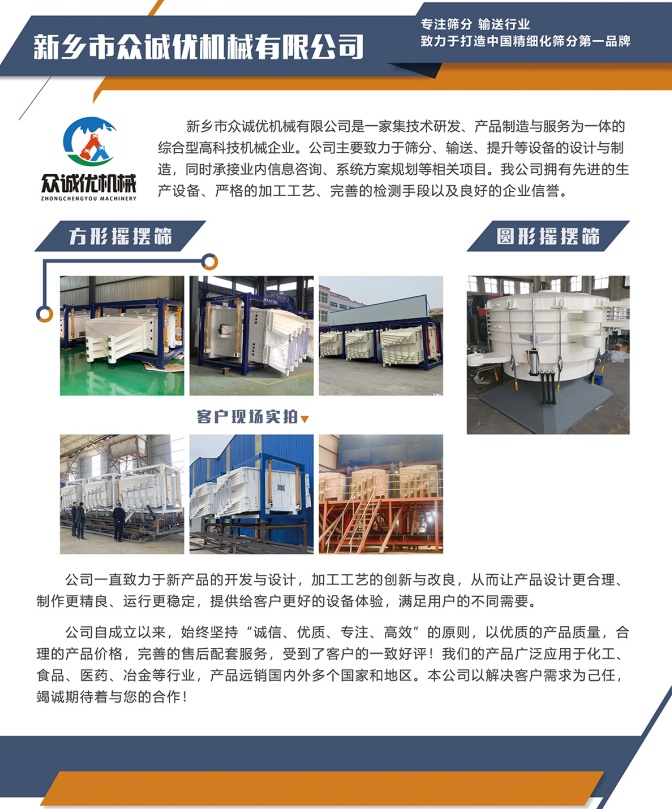 新乡市众诚优机械有限公司是一家集技术研发、产品制造与服务为一体的综合型高科技机械企业。公司主要致力于筛分、输送、提升等设备的设计与制造,同时承接业内信息咨询、系统方案规划等相关项目、/span>