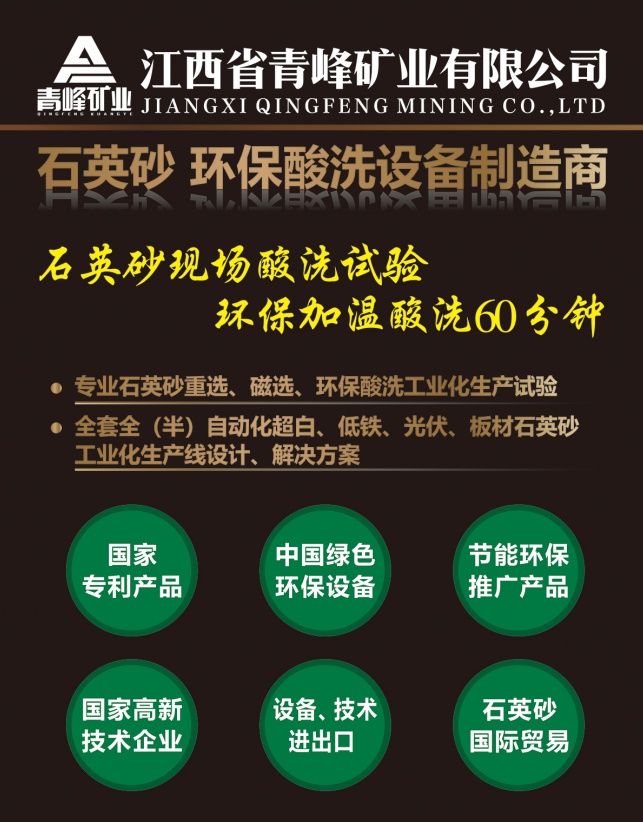江西省青峰矿业有限公司是国内从事石英石原矿、石英砂环保酸洗设备制造与石英砂提纯研究的科技型公司。由公司总工研发的专利产品“非金属矿石除铁酸洗反应釛/span>”为国内外众多石英加工企业解决了石英砂除铁増白难的问题,并授予为“中国绿色环保设备”“节能绿色环保推广产品”,得到了中科院、中国非金属研究院等有关部门领导的高度重视、/span>