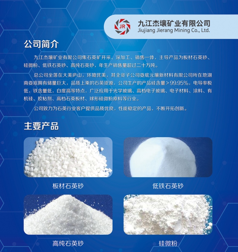 九江杰壤矿业有限公司集石英矿开采、深加工、销售一体,主导产品为板材石英砂?/span>硅微粈/span>、低铁石英砂?/span>高纯石英砂,年生产销售量超过二十万吨、/span>