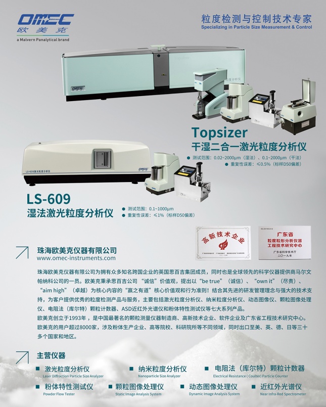 欧美克创立于1993年,是中国最著名的颗粒测量仪器制造商、高新技术企业,软件企业及广东省工程技术研究中心。具有深厚的测量理论研究功底和活跃的技术创新能力,取得多项专利及有价值的成果。其代表性的成就包括:等效直径理论、非球形颗粒的等效粒径、大颗粒Mie理论的必要性研究等。欧美克的激光粒度分析仪被认定为国家级火炬计划项目、国家级重点新产品。企业经营也卓有成效,领袖同群、/p>