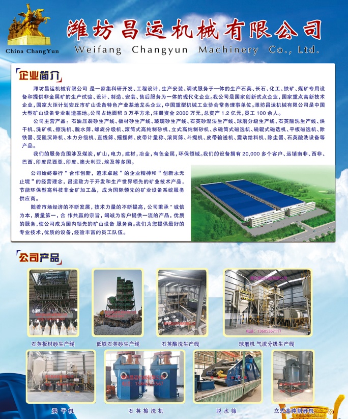 潍坊昌运机械有限公司——是一家集科研开发、工程设计、生产安装、调试服务于一体的生产石英、长石、化工、铁矿、煤矿专用设备和提供非金属矿的生产试验、设计、制造、安装、售后服务为一体的现代化企业。服务范围设计矿山、电力、造纸、玻璃、化工、水泥等行业、/p>
