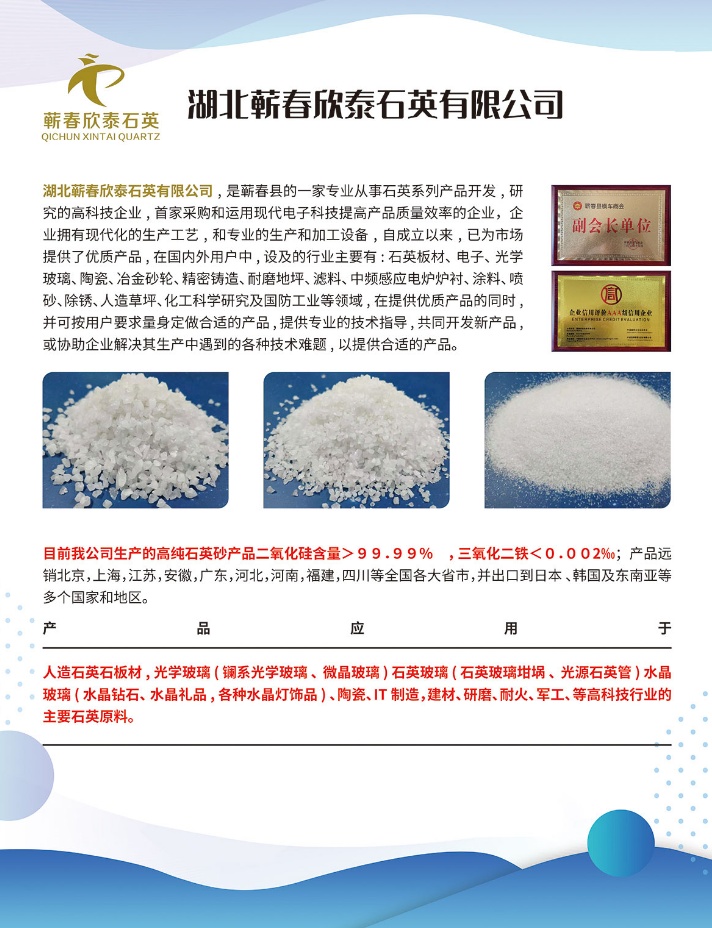 湖北蕲春欣泰石英有限公司,是蕲春县的一家专业从事石英系列产品开发研究的高科技企业,首家采购和运用现代电子科技提高产品质量效率的企业,企业拥有现代化的生产工艺,和专业的生产和加工设备,自成立以?已为市场提供了优质产?在国内外用户?设及的行业主要有:电子、光学玻璃、陶瓷、冶金砂轮、精密铸造、耐磨地坪、滤料、中频感应电炉炉衬、涂料、喷砂、除锈、人造草坪、化工科学研究及国防工业等领?在提供优质产品的同时,并可按用户要求量身定做合适的产品,提供专业的技术指?共同开发新产品,或协助企业解决其生产中遇到的各种技术难?以提供合适的产品、/p>
