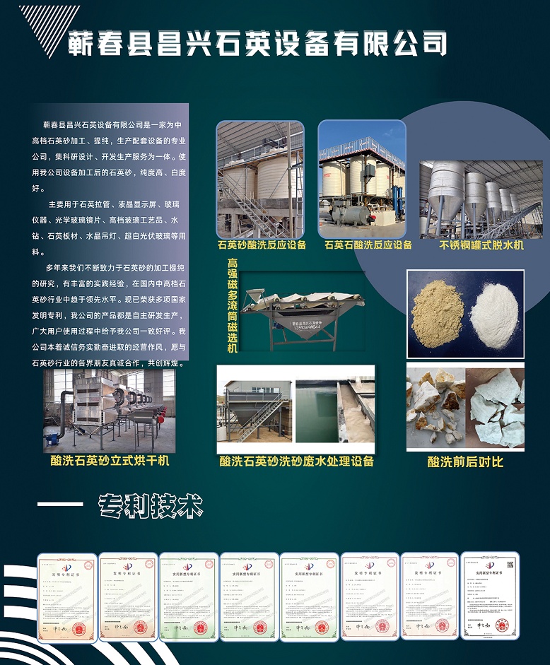蕲春县昌兴石英设备有限公司是一家为中高档石英砂加工、提纯,生产配套设备的专业公司,集科研设计、开发生产服务为一体、/p>
