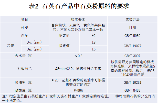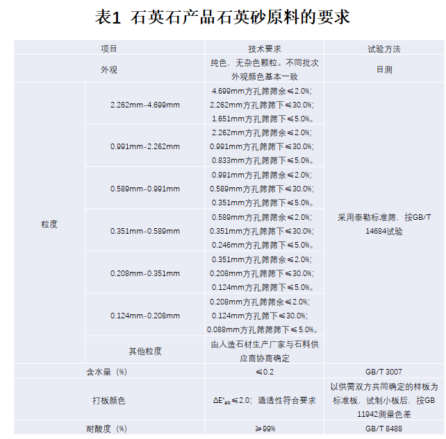 石英砂在人造石各类产品中主要应用在石英石产品中,这类产品目前主要在厨房和卫生间台面板使用,具有强度高、耐磨、耐污染等特征,是高端产品的必需原料。一些低端的台面板产品也选用了花岗岩、废玻璃或废瓷砖磨成的粒料或粉料,以满足装饰效果,但产品理化性能则大打折扣。石英石产品使用的石英砂要符合表1的要求,石英粉要符合?的规宙
