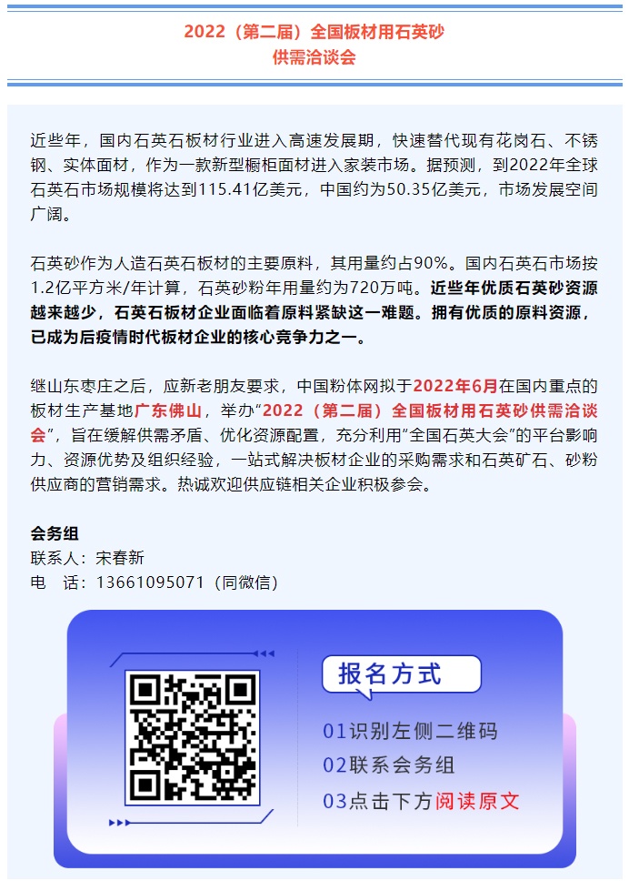 6?8号,?022(第二届)全国板材用石英砂供需洽谈会”将在广东·佛山南海保利皇冠假日酒店举行,广东中迅邀您一同参加、/span>