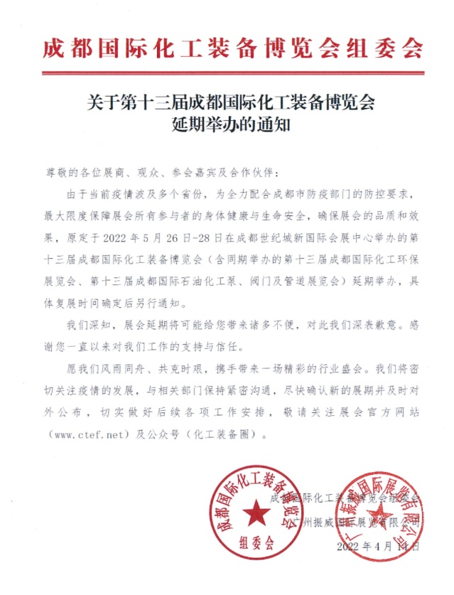 由于当前疫情波及多个省份,为全力配合成都市防疫部门的防控要求,最大限度保障展会所有参与者的身体健康与生命安全,确保展会的品质和效果,原定于2022??6?28日在成都世纪城新国际会展中心举办的第十三届成都国际化工装备博览会(含同期举办的第十三届成都国际化工环保展览会、第十三届成都国际石油化工泵、阀门及管道展览会)延期举办,具体复展时间确定后另行通知、/p>